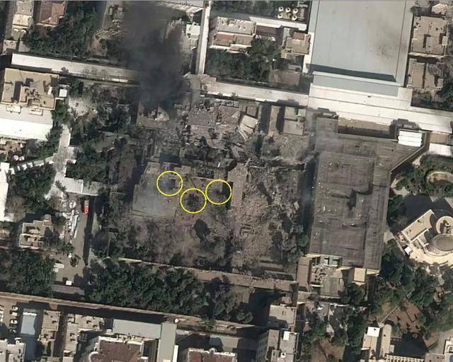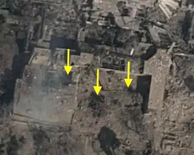 在已经被摧毁的官邸主楼,可以看到地面上留下了三个巨大的地洞。应该就是钻地弹打击留下的,在空袭发生后,可能有内线确定了,人已经进入X号掩体。